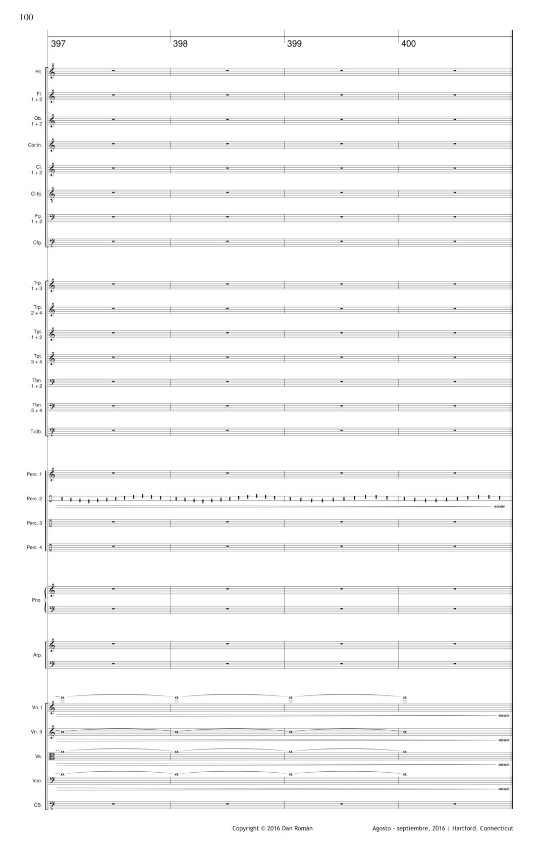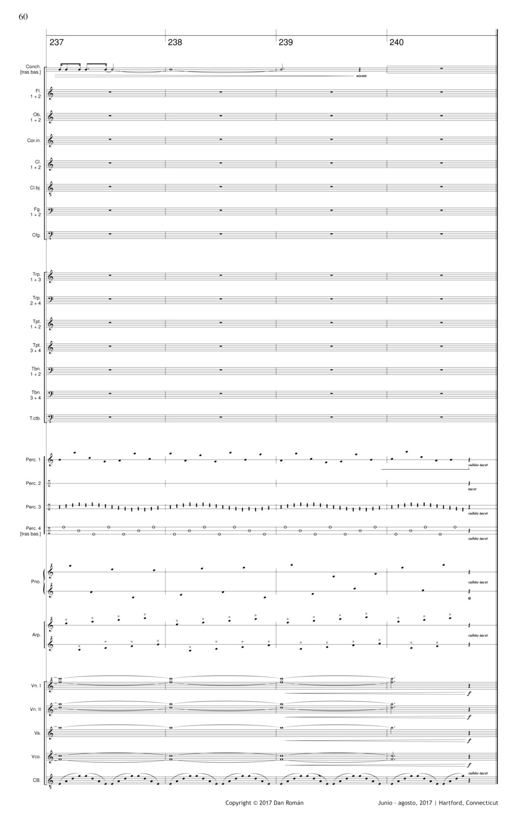I made a conscious effort to avoid rhythmic or stylistic clichés that might imitate a Taíno musical style. Instead, any use of nontraditional instruments, such as wooden wind chimes or a seashell, is intended only to represent a particular Taíno story or character.