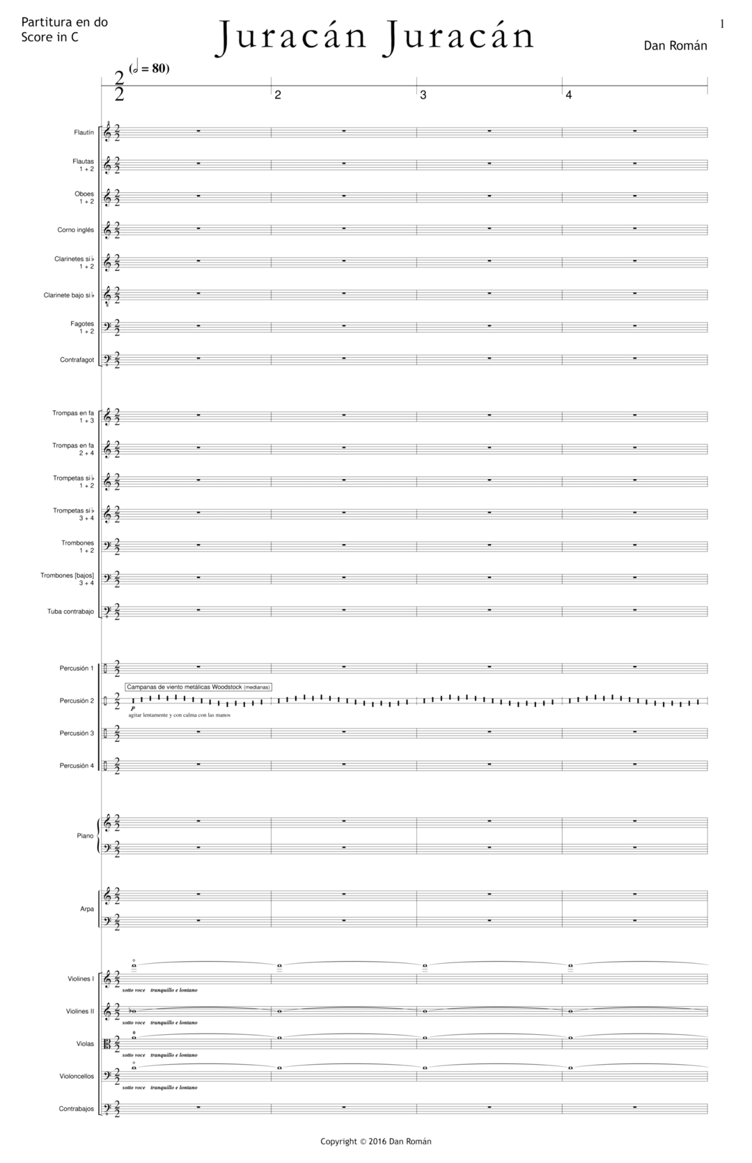 The palindromic structure of this piece mirrors the spiral form of a hurricane, with bands of winds radiating from the center and a clearly defined eye offering a moment of eerie calm. Two climactic peaks represent Juracán’s rage at full force and the terrifying voice of the storm from above.
